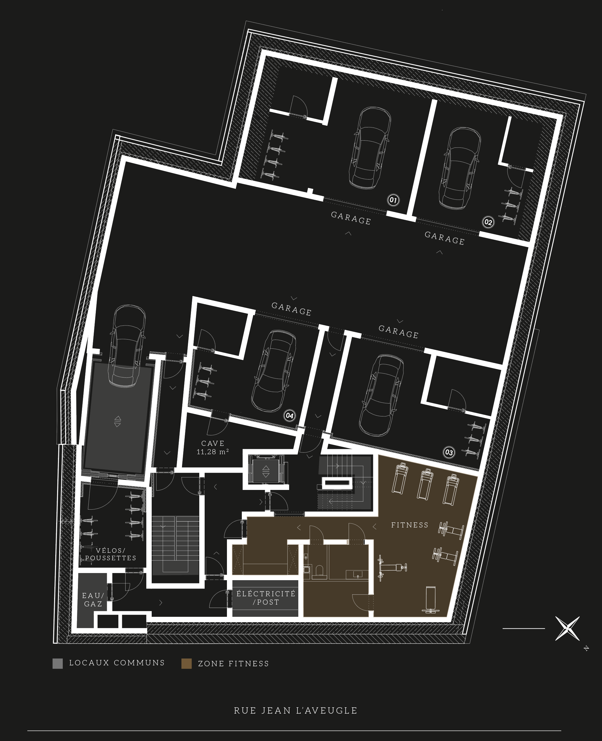 Vous trouverez au premier sous-sol, accessible par l’ascenseur principal ou l’escalier, une superbe salle de fitness, les emplacements de quatre parking privés ainsi que trois caves.