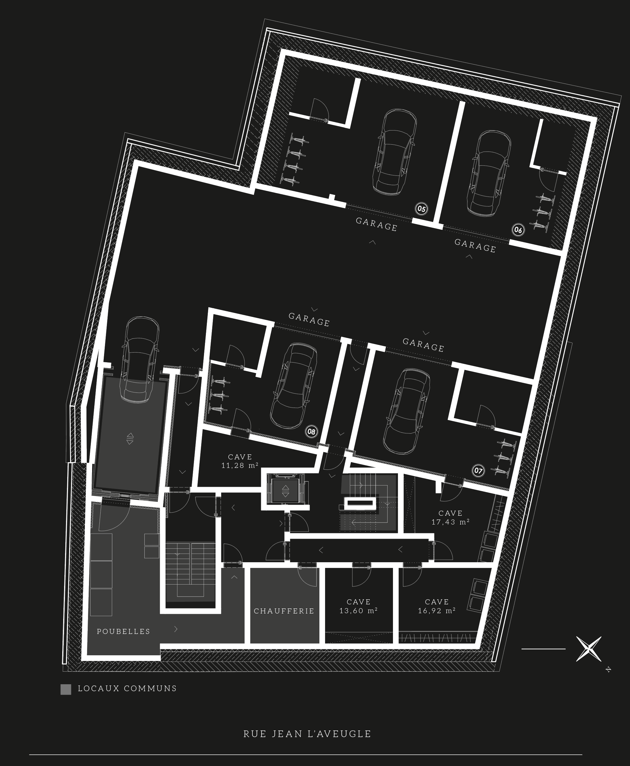 Au dernier sous-sol, toujours accessible par l’ascenseur principal ou l’escalier, vous retrouverez les emplacements de quatre parking privés ainsi que quatre caves.